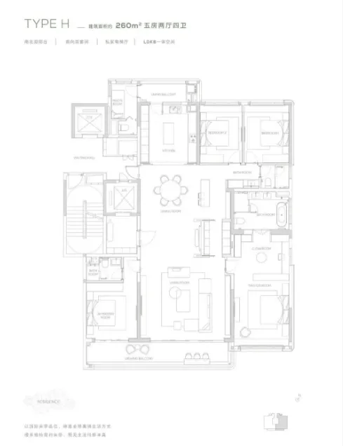 260㎡与264㎡五房四卫户型,是项目的高端改善户型,功能分区细致,居住舒适度更高。四卫的配置,能充分满足多人口家庭的使用需求,避免了任何使用冲突;户型设计上注重细节,260平方米的大平层产品特别增设了家政间和独立储物空间,充分考虑了高端客群的实际生活需求。室内采用大面积低饱和度色调的木饰面,搭配无主灯设计,营造出温馨、自然的居住氛围;大尺度的全景落地窗,让阳光和景观充分进入室内,提升了居住的品质感。
