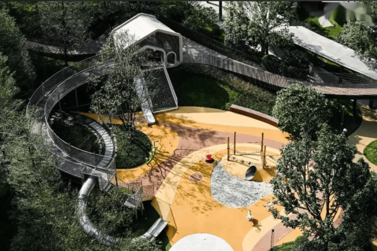 项目还利用半山地势,打造了独特的台地园林,创新提出“折叠园林”理念,将外部半山景观与台地园林自然融合,形成“林中藏园,园中有景”的立体景观效果。园林内设置了空中栈道、半山观景平台、全龄儿童游乐场等多个功能区域,还通过半露天连廊贯穿各区域,无论晴天雨天,都能惬意地在园林中漫步。