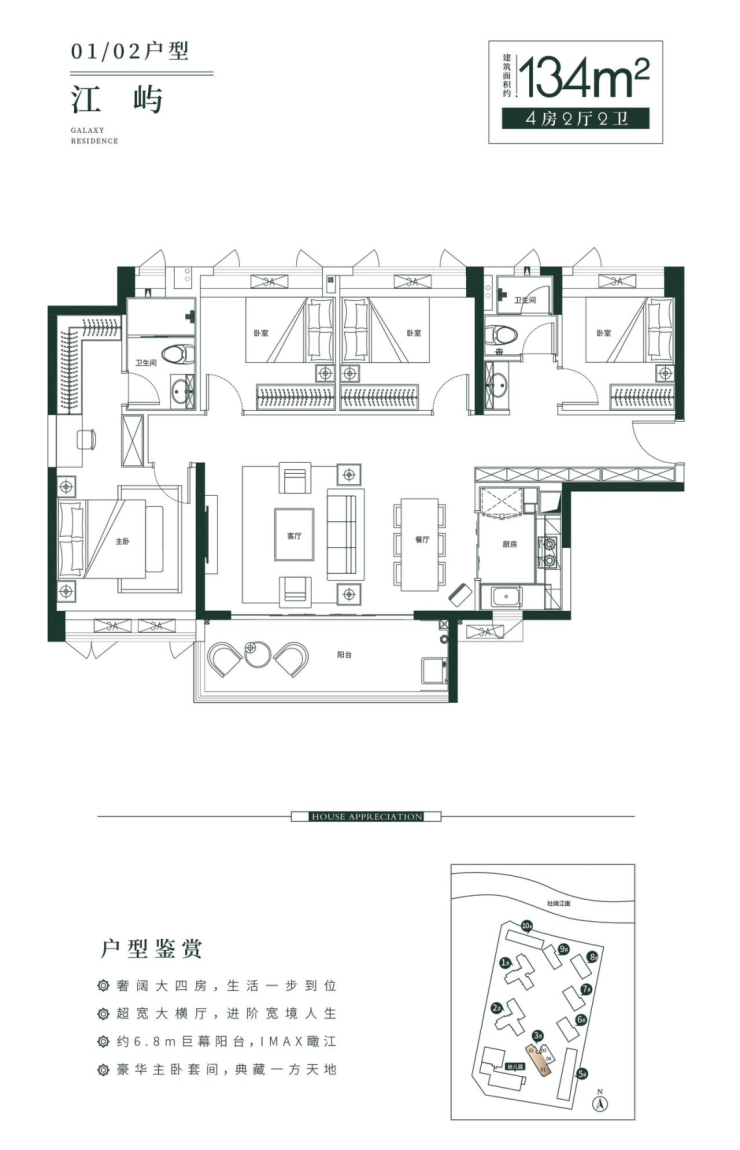 项目户型设计兼顾实用性和舒适性,三至四房户型空间合理,动线流畅。99平方米三房户型采用经典竖厅设计,U型厨房布局,使烹饪动线顺畅;约6.2米宽阳台可一览江景;奢阔主卧套房空间开阔,为居住者提供舒适私密体验。134平方米四房横厅户型,巨幕阳台约6.8米,采光通透且视野开阔,豪华主卧套间设计,使生活舒适度与实用性兼具。每一户型都注重细节体验,满足现代家庭对居住品质的全面需求。