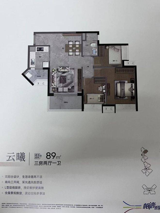 89㎡三房:三开间朝南,客厅宽敞且采用双阳台设计,不仅保证了充足的采光和通风,还增加了空间的实用性与舒适度,是整个项目中较为优质的户型,预计会备受青睐,十分抢手。
