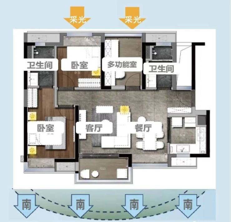 97㎡:三开间朝南经典户型主人房,3.3米大飘窗,5.8米奢阔阳台
