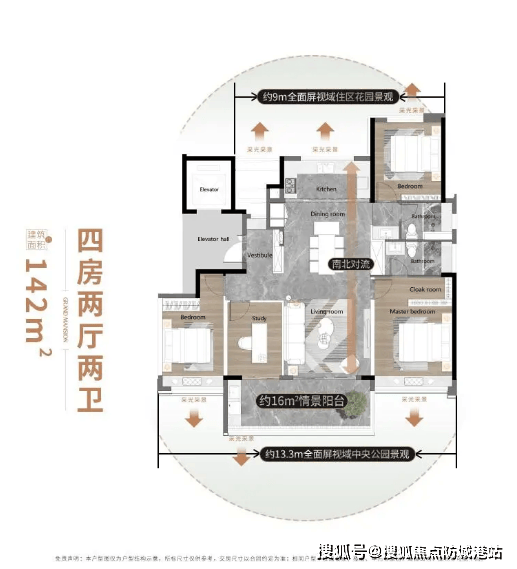 户型:建面约110-175㎡四房,16-24层小高层,2梯2户/3户设计,私密性极佳。