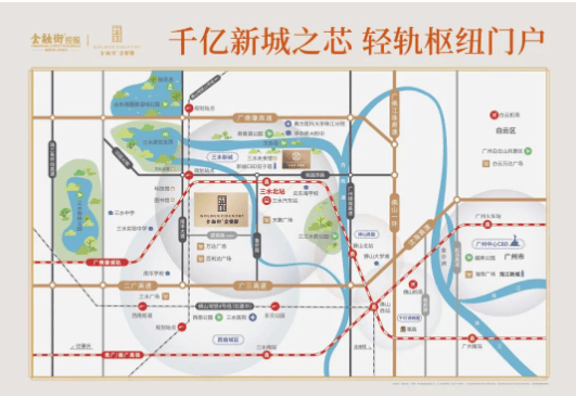 【金融街金悦郡】位于三水新城的核心区域,紧邻万达广场,享有绝佳的CBD位置优势。交通便利,规划中的广佛肇轻轨、佛山地铁12号线及地铁4号线将无缝连接广佛肇地区,进一步提升该区域的便捷性。周边配套完善,包括双子星城、天聚广场等商业设施,以及荷香湖、三江水韵公园等六大公园环绕,尽享都市繁华与自然美景。