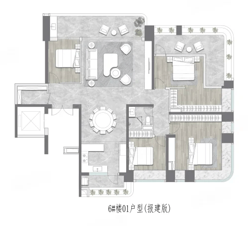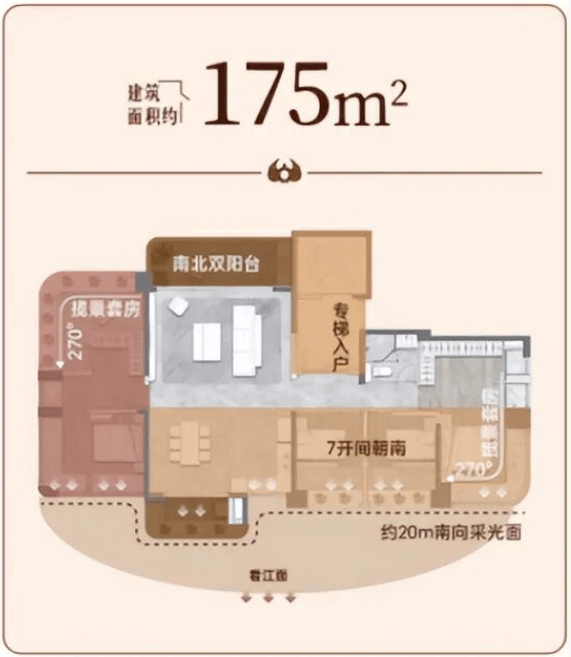 215㎡四房:专梯入户,三面江景,双阳台+双主卧,层高3.3米,适配多代共居;