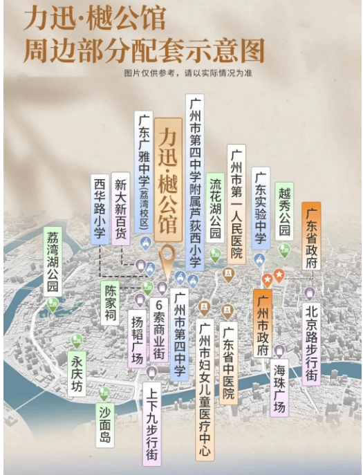 小学方面,项目周边紧邻西华路小学、四中附属芦荻西小学两大优质小学。其中,西华路小学已纳入西关外国语教育集团管理,依托集团优质教育资源,教学质量有保障;四中附属芦荻西小学隶属于广州四中教育体系,师资力量雄厚,教学经验丰富。参考周边万科金色康苑小区的对口小学划分,力迅樾公馆业主子女大概率对口四中附属芦荻西小学,具体以官方地段划分公示为准。