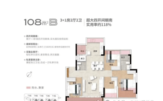 力迅樾公馆整个项目规划有5栋10层南向板楼,均为一梯两户设计,仅服务18户业主,出行从容不拥挤,且所有户型均朝南,采光、通风效果极佳。项目在售户型共三种,分别为98平、108平、156平,全四房设计,依托新规优势,最高使用率可达118%,空间利用率高,适配不同家庭的居住需求。