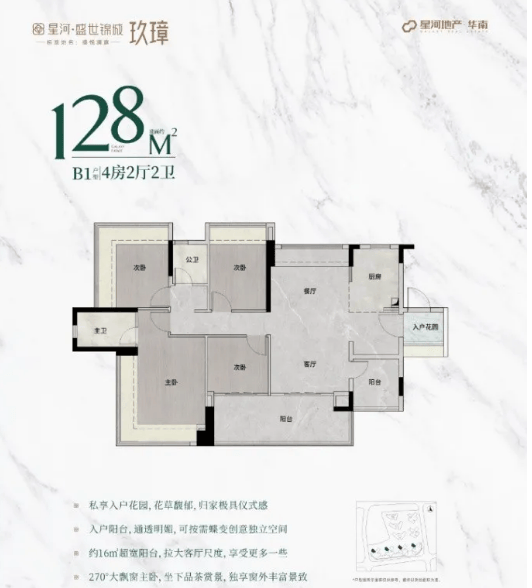 Q2:项目目前主推哪些户型?实用率怎么样? A2:项目目前主推三期【玖璋组团】的98-110-128㎡三至四+1房户型,共5个户型。所有户型均采用全新规设计,实用率高达100%以上,赠送面积充足,空间尺度开阔。