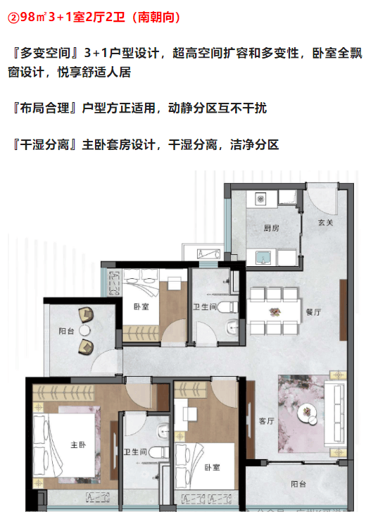 98㎡3+1室2厅2卫:灵活的空间布局,卧室全飘窗设计,提高了居住舒适度。