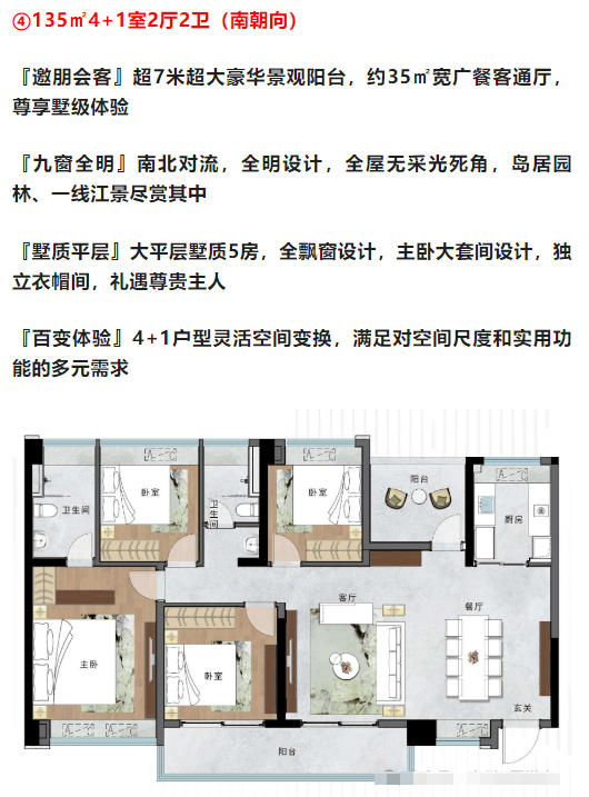 135㎡4+1室2厅2卫:豪华景观阳台,主卧大套间设计,满足对空间尺度和实用功能的多元需求。