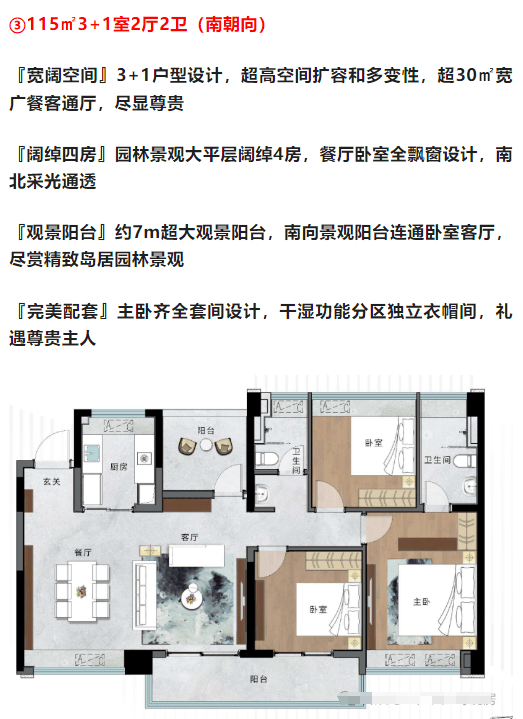 115㎡3+1室2厅2卫:超30平方米宽广餐客通厅,南北采光通透,享受精致园林景观。