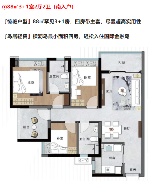 88㎡3+1室2厅2卫:罕见的小面积四房设计,适合追求性价比的家庭。