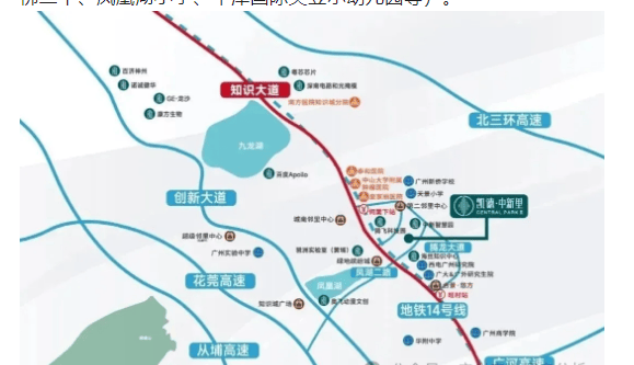 从发展规划来看,知识城依托“一核两轴三组团”的空间布局,不断完善交通路网与公共配套。九龙大道作为板块的核心主干道,贯穿南北,串联起区域内的重要配套与产业园区;地铁14号线、21号线的开通运营,更是打通了知识城与天河、科学城等核心区域的交通脉络,实现了“半小时生活圈”的构想。