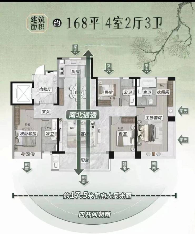 以建面约168平方米户型为例,其最大的亮点在于“南向五开间”的设计。这意味着客厅、主卧、次卧、书房以及另一个次卧全部朝南布置。这种布局确保了家庭成员在白天的大部分时间里都能享受到阳光。同时,项目采用了“双套房”设计,即主卧和其中一个次卧均配备独立卫生间。这不仅提升了居住的便利性,更解决了多代同堂家庭中可能出现的如厕冲突问题。三房朝南的布局,使得每个卧室都有独立的采光面,避免了暗房的出现。