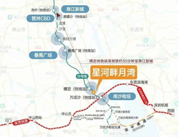 尽管地处南沙,但星河·畔月湾的交通便利性远超想象。项目接驳被誉为“中国最快地铁”的广州地铁18号线,设计时速高达160公里/小时。从横沥站出发,1站可达番禺广场,2站直达琶洲,3站即抵珠江新城,4站轻松抵达天河冼村——真正实现“半小时畅达广州核心区”。