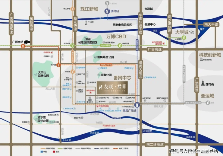 地铁:项目距3号线市桥站直线距离1.2公里(车程8分钟),2026年底开通的22号线市广路站(直线距离1.5公里)将实现15分钟到珠江新城;