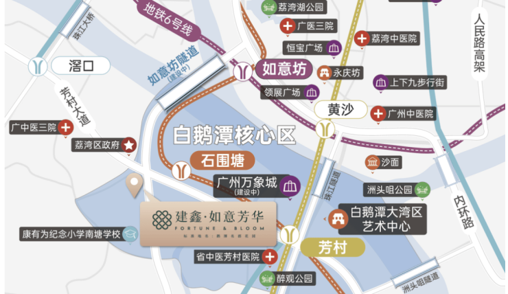 项目社区园林面积约2.1万平方米,结合岭南文化与宝格丽酒店美学打造全龄乐活空间,营造舒适宜居氛围。周边底商、综合市场步行可达,满足日常生活需求。未来白鹅潭万象城和聚龙湾太古里等高端商业项目落地后,将进一步提升区域商业能级。医疗配套覆盖省中医芳村医院及广医大附属中医医院等多家医疗机构,实现24小时健康保障。项目周边休闲娱乐资源丰富,包括荔湾湖、永庆坊及白鹅潭大湾区艺术中心,为业主提供高品质文化生活体验。生活、商业、生态和文化资源的有机结合,使建鑫·如意芳华具备全能便利生活优势。