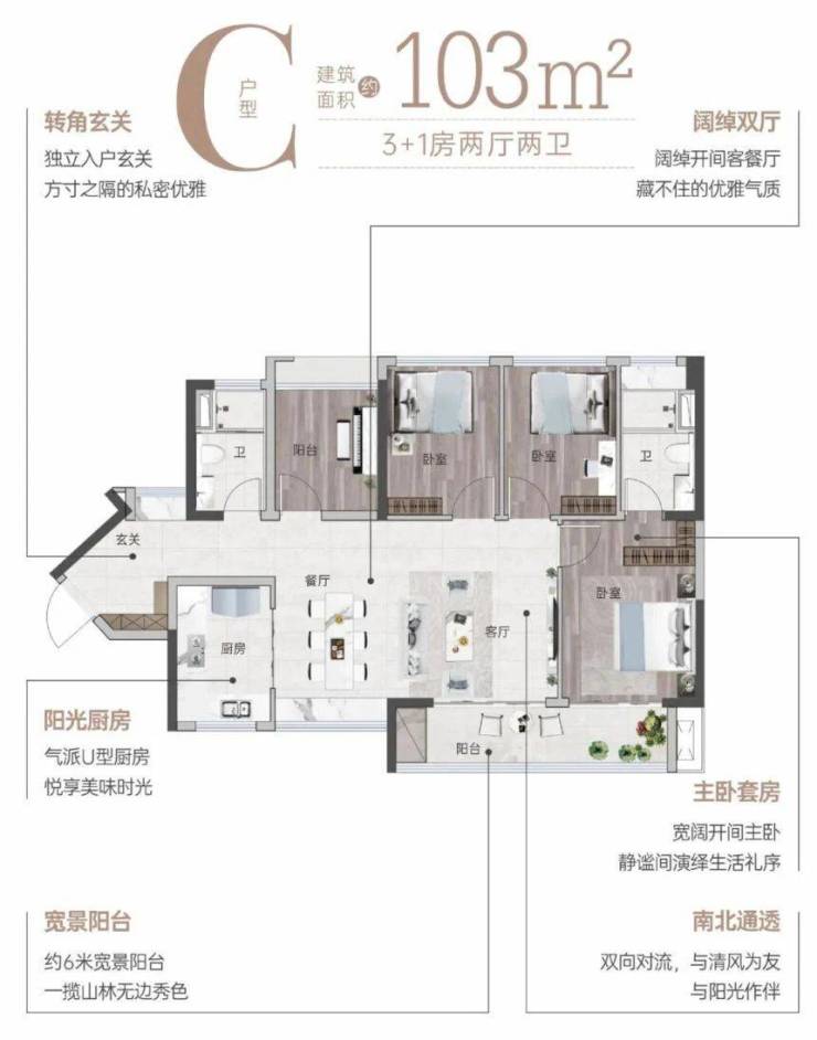 103㎡横厅四房:这是项目的高端户型,配备6米超宽阳台,南北通透,采光通风效果极佳。横厅设计打破了传统客厅的局限,使得公共空间更加开阔大气,适合家庭聚会和社交活动。使用率超过94%,几乎做到了零浪费。这种户型特别适合三代同堂的家庭,既有独立的休息空间,又有共同的交流区域,兼顾了隐私与亲情。