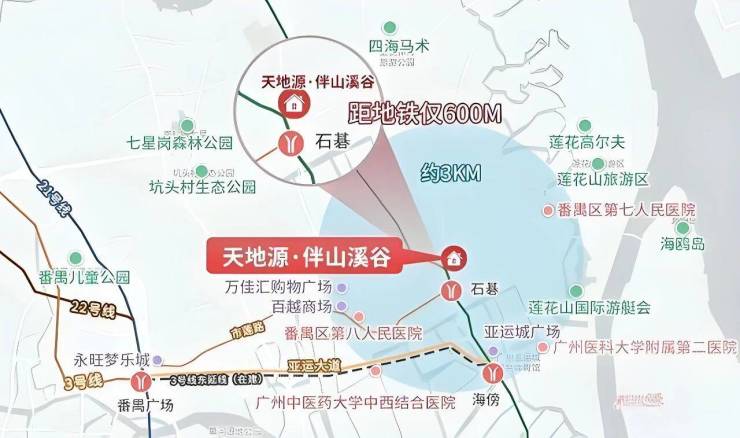 除了现房这一核心优势外,天地源伴山溪谷在区位交通上的布局同样令人瞩目。项目地处番禺石碁板块,这里是连接广州中心城区与东部新城的重要枢纽,也是未来广州城市拓展的关键节点。更为重要的是,项目距离地铁4号线石碁站仅约600米,这一距离在房地产界被称为“黄金步行圈”。对于依赖公共交通出行的现代都市人来说,每天节省下来的通勤时间,不仅仅是数字上的减少,更是生活质量的巨大提升。从石碁站出发,仅需一站即可抵达充满学术氛围的大学城,五站便能直达琶洲 CBD,这里汇聚了阿里巴巴、腾讯、网易等互联网巨头以及广交会等世界级会展资源。这意味着,居住在天地源伴山溪谷,意味着你拥有了一条通往城市核心就业圈的快速通道,将原本可能长达一小时以上的通勤时间压缩至半小时以内,让“职住平衡”不再是一句空话。