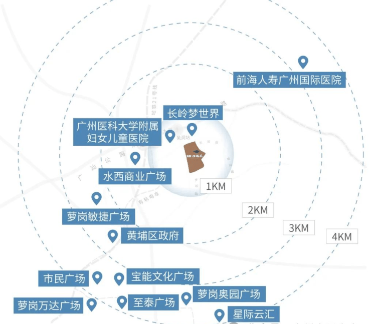 距离地铁21号线长平站约2.2公里,步行不便,但可通过1站换乘至黄埔区府(水西站),2站至万达广场(苏元站),5站到天河智慧城。