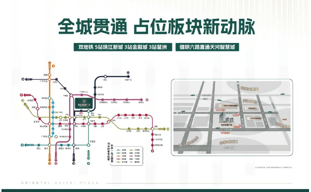 东方财智广场地理位置优越,交通网络四通八达。它紧邻地铁21号线棠东站,并且距离规划中的19号线广氮西站也仅一步之遥。此外,项目周边还有多条公交线路覆盖,极大地提升了出行便利性。