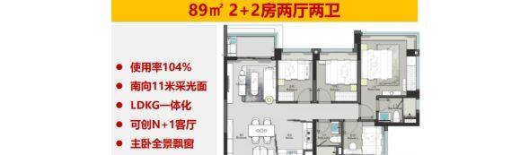 建面约 89㎡四房两卫:南向采光面达 11 米,空间开阔明亮。四房格局可容纳三代同堂,双卫设计避免使用冲突,主卧为套房设计,适合人口较多的刚需改善家庭。售楼处电话:4009909752 。