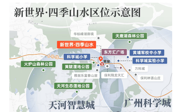 教育配套方面,项目自带幼儿园与托儿所,周边1公里范围内聚集5所小学(含规划中1所)及2所中学,包括科学城小学、黄陂小学、黄埔军校小学、117中学、黄埔军校中学等。其中,黄埔军校中小学为省一级学校,虽非对口直升、需参与电脑派位,但距离适中且全程无需横穿主干道,安全性优于区域内其他竞品。相比部分需穿越广汕公路接送孩子的楼盘,四季山水在儿童出行安全上更具优势。尽管缺乏明确顶级学区加持,但整体教育资源密度高、选择多元,足以满足普通家庭的基础教育需求。
