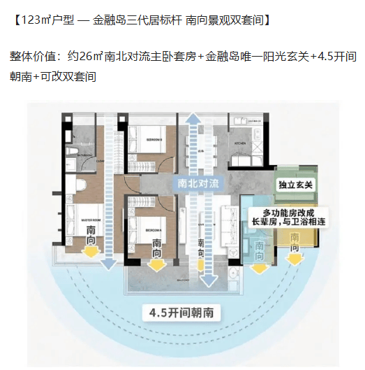 核心亮点:约 26㎡南北对流主卧套房,配备独立衣帽间与卫浴;金融岛唯一阳光玄关,进深 1.8 米,可设置鞋柜与展示区;4.5 开间朝南,采光面达 12.6 米。