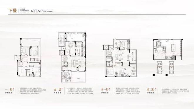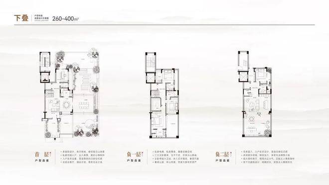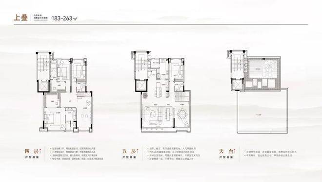 白云堡・三期的户型设计独具匠心。“观善居” 的 180㎡云端平层,采用创新 LDKB 一体化格局,270° 环幕瞰山视野,奢阔主卧套间配置以及双洄游动线设计,空间开阔且功能多样,充分利用每一寸空间,提升居住舒适度。180 - 400㎡的叠院臻品,上叠有星空露台和云端花园,三层立体生活空间;下叠有私属庭院和地下多功能厅,双首层立体院落,既保证了居住的私密性,又实现了空间的高效利用。观善居180㎡上叠创意布局示意图悦融居183-263㎡上叠创意布局示意图