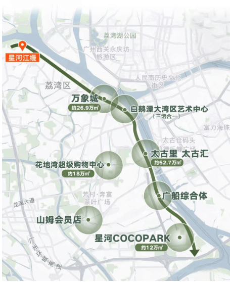 地理位置:星河江缦位于广州主城核心的白鹅潭CBD(荔湾区芳村大道西滘口大街),距离珠江最近的地方仅90米,拥有700米长的长江岸线。此外,项目周边还有约1.8万平方米的滨江公园,为居民提供了丰富的休闲空间。