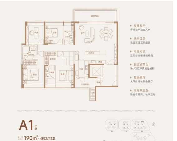 项目产品力以 “精准定位 + 细节设计” 打动改善群体。户型方面,主打 103-257㎡全南向纯四房户型,适配从刚需改善到高端豪宅的多元需求。设计上融入超 6 米宽境阳台与生活阳台,主卧开间超 3 米,兼顾采光、观景与通风,89% 的得房率让空间利用率最大化。