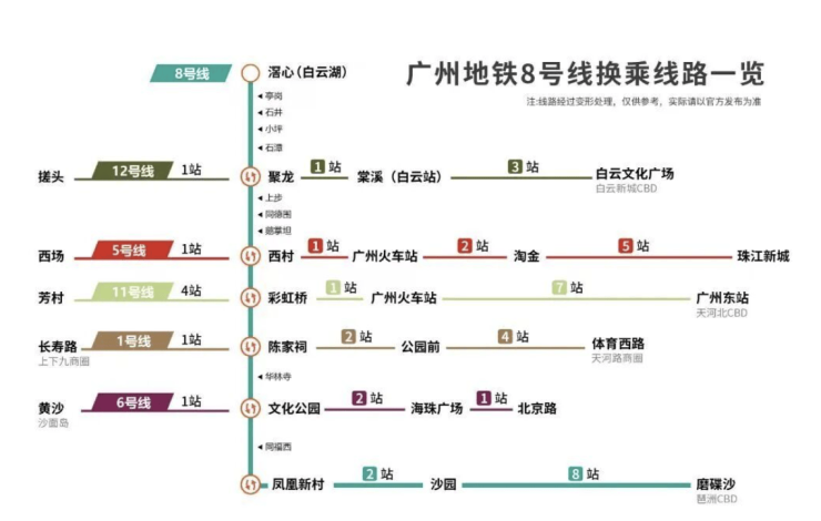 城市价值的核心在于交通,而云湖花城正是交通网络的中心节点。项目距离地铁8号线亭岗站仅约400米,是真正意义上的地铁上盖社区。8号线作为广州的换乘主线,连接荔湾、海珠、客村、琶洲等繁华商圈,拥有八大换乘枢纽,覆盖主城区核心动脉。从项目出发,三站直达广州白云站,通达全市乃至粤港澳大湾区各大城市。