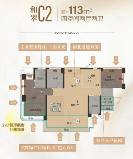 建面约113㎡:四房两厅两卫,空间宽敞,布局合理,适合大家庭居住。
