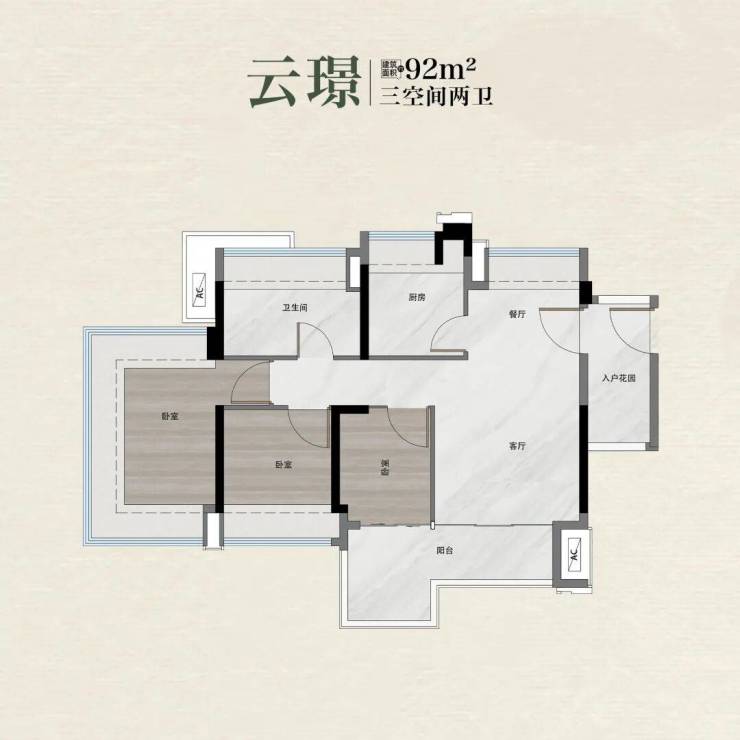 89平方米户型采用独立入户花园设计,增强私密性与归家仪式感,同时配置双卫布局,提高使用效率。L型双阳台设计带来更开阔的视野与更好的采光条件。