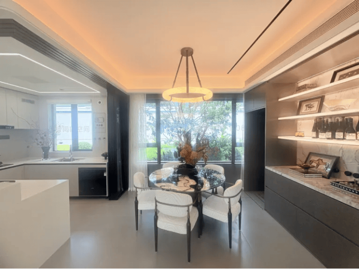 LDKG一体化设计(客厅+餐厅+厨房+阳台):动线流畅,家庭互动无阻隔,逢年过节开家宴也毫不局促。