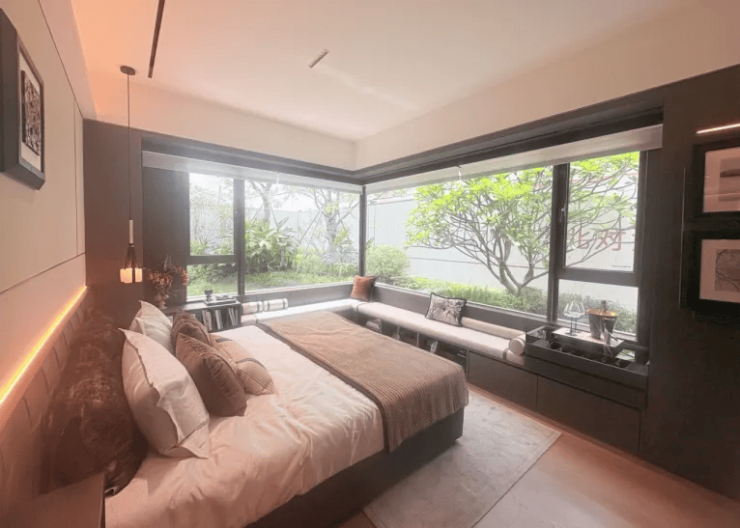 主卧带270°环幕视野:南向飘窗引入充足采光,窗外即是社区园林或滨水公园,晨起拉开窗帘,满目绿意扑面而来。