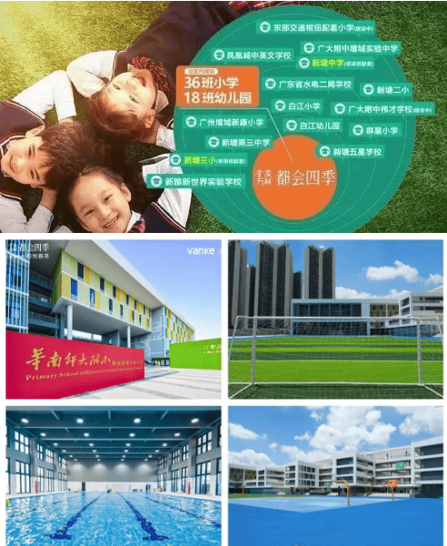 万科都会四季内设有一所18班幼儿园和一所48班的华南师范大学附属小学,后者是广东省唯一一所由广东省教育厅和华南师范大学双重领导下的省一级学校,被誉为“全国百强小学”。此外,对口的新塘三中已加入增城广附教育集团,确保了教育资源的质量和统一管理标准。