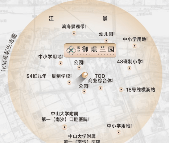 配建幼儿园、48 班小学及 9 年一贯制学校,小学明年开学,九年一贯制学校后年开学。南沙区官方提及与广州大学、市教研院组建区属教育集团,有望引入名校资源。此外,周边还有湾区实验学校等 5 所学校环绕,为孩子提供全龄段优质教育。