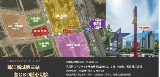项目距地铁 18 号线横沥站仅约 80 米,18 号线时速高达 160km/h,无需换乘即可 1 站达万博 CBD、2 站到琶洲、3 站至珠城 CBD,还规划延伸至中山、珠海等大湾区城市,极大缩短了与大湾区各核心区域的时空距离,为居民出行和商务往来提供了极大便利。