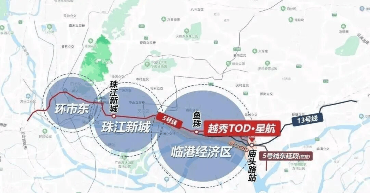 越秀滨江星航TOD最大的核心优势在于其优越的TOD交通配套,项目紧邻地铁5号线东延段庙头路站,直线距离仅80米,属于真正的地铁上盖物业。根据广州地铁官方发布的最新运营规划,5号线东延段已实现通车运营,从项目出发,无需换乘即可直达珠江新城、天河路商圈等核心区域,通勤时间缩短至30分钟以内,极大提升了出行效率。同时,项目临近13号线南海神庙站,步行500米即可抵达,双地铁交汇,轻松实现全城便捷通达。
