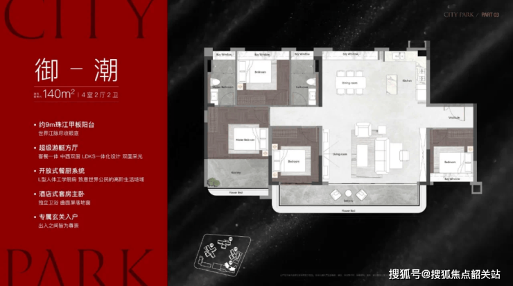 景观面:超宽阳台、L型主卧转角飘窗、客厅预留观景飘窗,最大化放大观江视野。