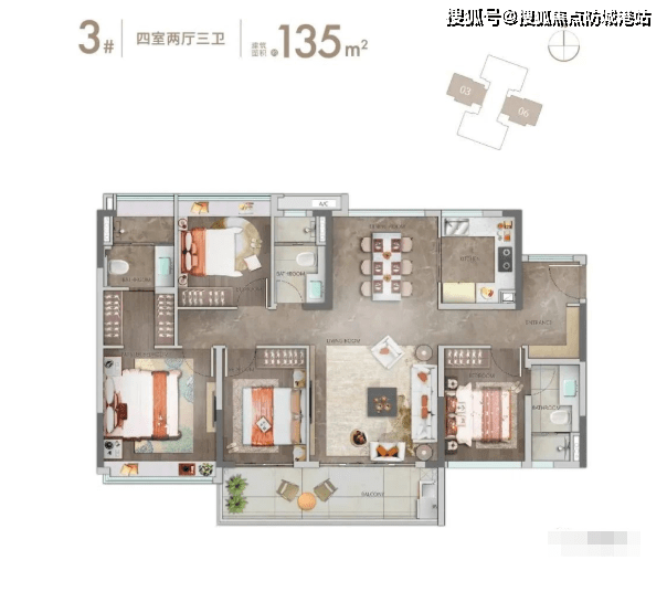 140㎡四房:四开间朝南,双阳台设计,采光面达12米;