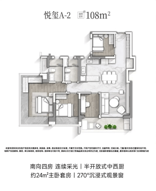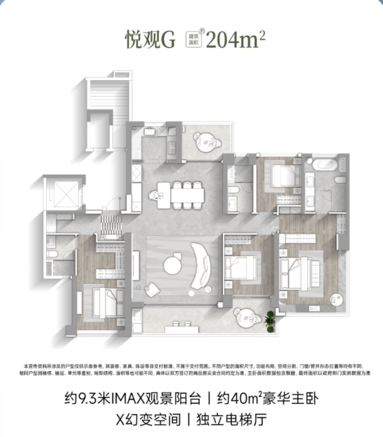 项目提供了多样化的户型选择,满足不同家庭结构的需求。一期推出的户型面积从约123㎡到204㎡不等,包括豪华主卧套房、南北通透的设计等特色。二期则推出了更多小户型产品,如建面约108-111-124平全南向纯四房,适合刚改需求的家庭。特别是二期新增的“天空之境”设计——270°U型无遮挡柱的全画幅飘窗景观,为居住者带来了极致的视觉享受。