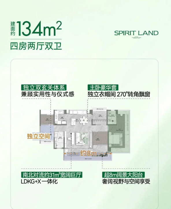 建面约134㎡ 四房两厅两卫:千万级豪宅同款,带入户花园中西分厨+六人圆桌,稀缺南北通透。