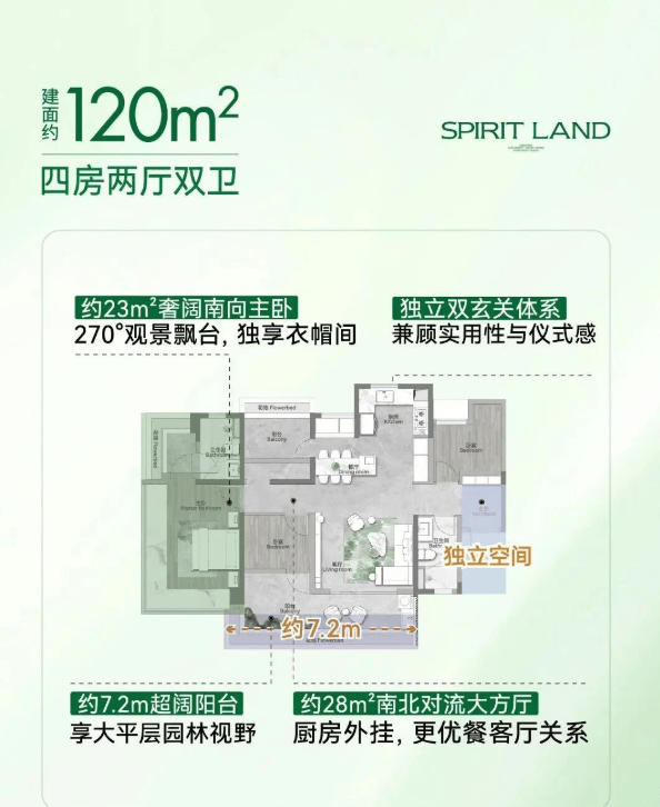 建面约120㎡ 四房两厅两卫:海珠唯一1000万内南北通透大四房,双玄关入户 LDKG+X 约28m²南北对流大方厅。