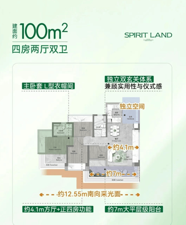 建面约100㎡ 四房两厅两卫:海珠唯一100方内正四房,LDKG+X一体化 4.1m方正巨厅,约7.2m大平层级阳台。