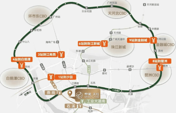 中建·天钰坐拥三条地铁线路,分别是广佛线燕岗站、石溪站以及10号线工业大道南站,步行距离均在10分钟之内。这使得居民可以便捷地前往海珠琶洲、天河、越秀等核心板块,极大地提升了生活便利性。