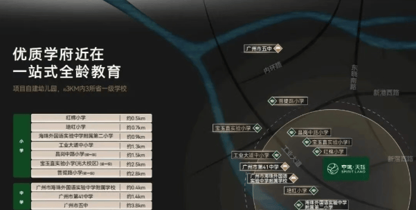 虽然项目自带一所幼儿园,但小学以上教育依赖周边资源,最近的公办小学是海珠区金碧第一小学(西校区)和海珠区石溪劬劳小学,两所小学对口初中分别在第五组和第七组,为孩子的成长提供了稳定的教育环境。