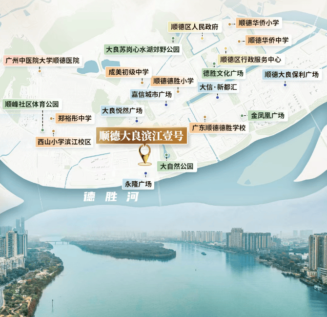 大良滨江壹号二期地处德胜新城西部板块,周边3公里范围内覆盖完善的商业、教育、医疗及市政配套,日常生活需求无需远距离奔波。商业配套方面,周边分布多个成熟商圈与社区底商,涵盖超市、餐饮、零售、生鲜市场等业态,能满足日常购物、聚餐、休闲等需求;教育资源方面,周边布局多所公办幼儿园、小学与中学,教育氛围浓厚,子女就近入学便捷;医疗配套方面,邻近综合性医院与社区卫生服务中心,日常就医、体检等需求可快速响应;市政配套方面,项目靠近大良区府,周边配有图书馆、体育馆、文化活动中心等公共设施,丰富业主精神文化生活。此外,项目周边坐拥五公里滨江长廊与多个市政公园,闲暇时间可前往散步、慢跑、露营,享受生态休闲空间,整体配套成熟度高,居住生活便利性突出。