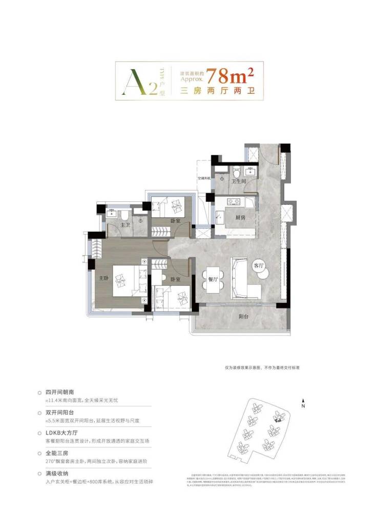 实测案例:78㎡三房两卫户型使用率达121%,超越同板块99㎡三房(使用率仅79%)。