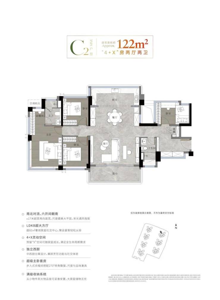 空间革命:通过可变隔断设计,交付时为三房(客厅开间5.4米),后期可灵活改造为四房;